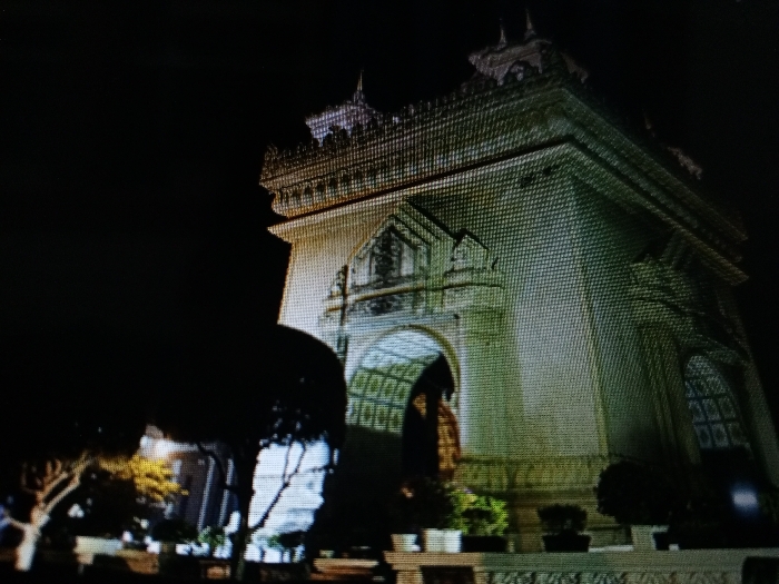 The image displays a large, ornate monumental arch structure at night, identified as being in the city of Keo Kouang, Laos
