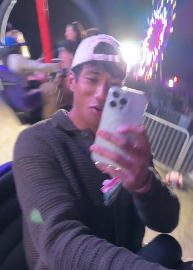 blurry shot of a carnival ride at night. The ride appears to be spinning, with bright lights in the background. There are people riding the ride, and one person is seen holding a phone and taking a selfie. The ground is covered in grass and there are some barriers around the ride.