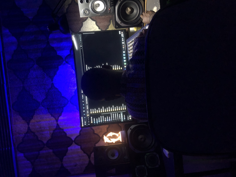 A dimly lit room reveals a person seated before a computer screen displaying audio software. Studio monitors are positioned nearby, both above and below the screen, indicating a possible recording or mixing environment. A patterned rug adds texture to the scene, lit by a blue light source on the left side. A dark object is also in the scene, obstructing the view.