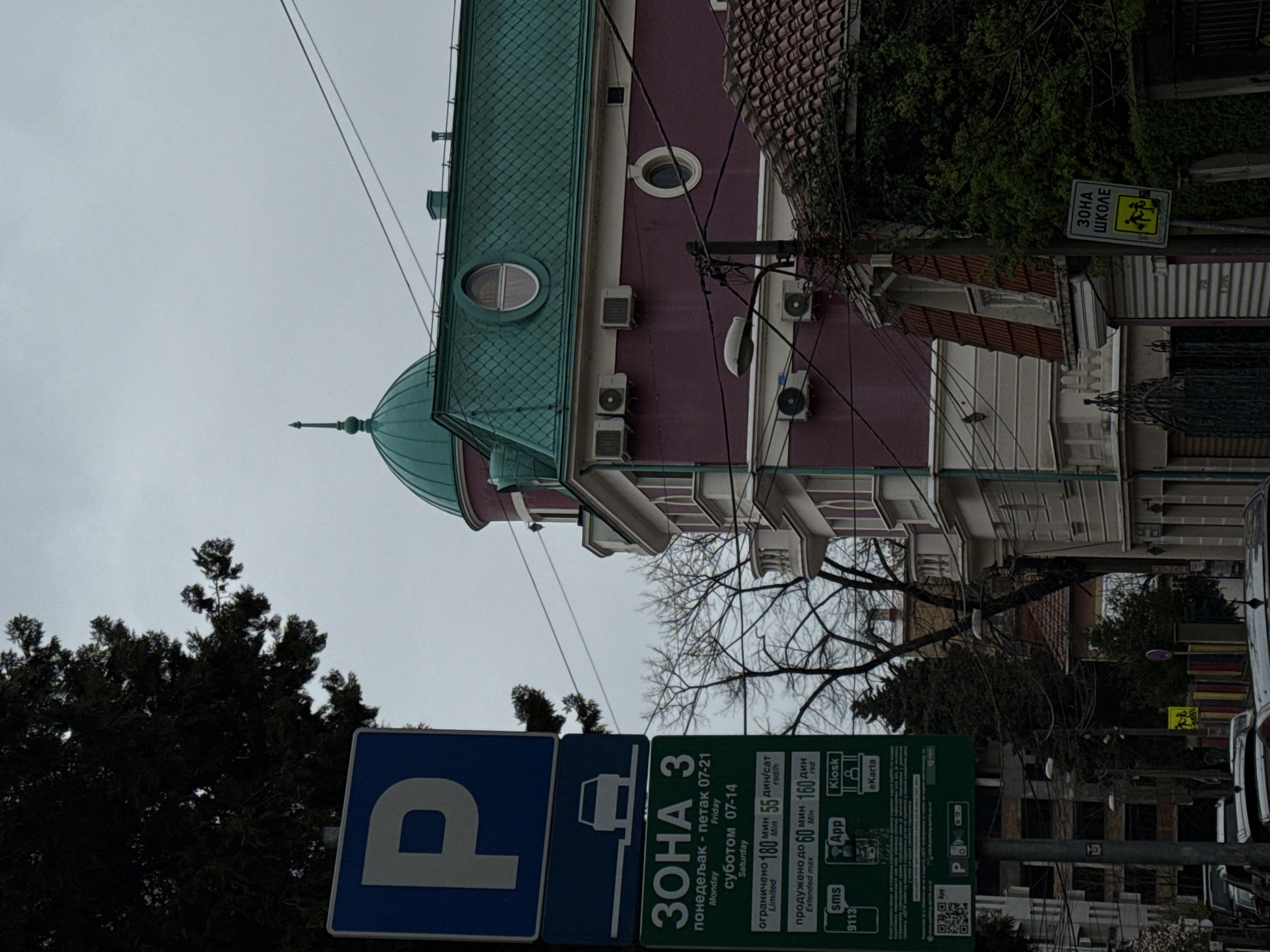 street scene in Belgrade, Serbia. A blue "P" parking sign is prominently displayed, with a green sign indicating that it is "Zona 3" parking. The sign also lists the hours, days, and prices for parking in this zone. Behind the parking sign is a large tree and a building with a green dome and red walls. The building has a school zone sign ("30HA ШКОЛЕ"). The sky is overcast. Some parked cars can be seen on the right side of the frame. Electrical wires run across the image.