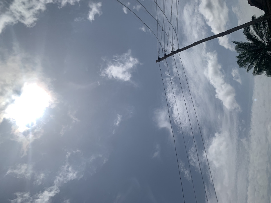 The scene captures an outdoor sky view in Adankolo, Nigeria, under bright, partially cloudy conditions