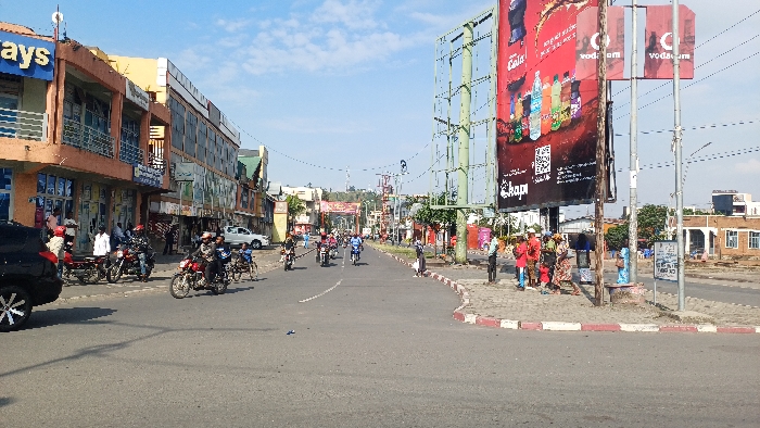This image depicts a bustling commercial street scene in Goma, Democratic Republic of the Congo, likely along a main thoroughfare