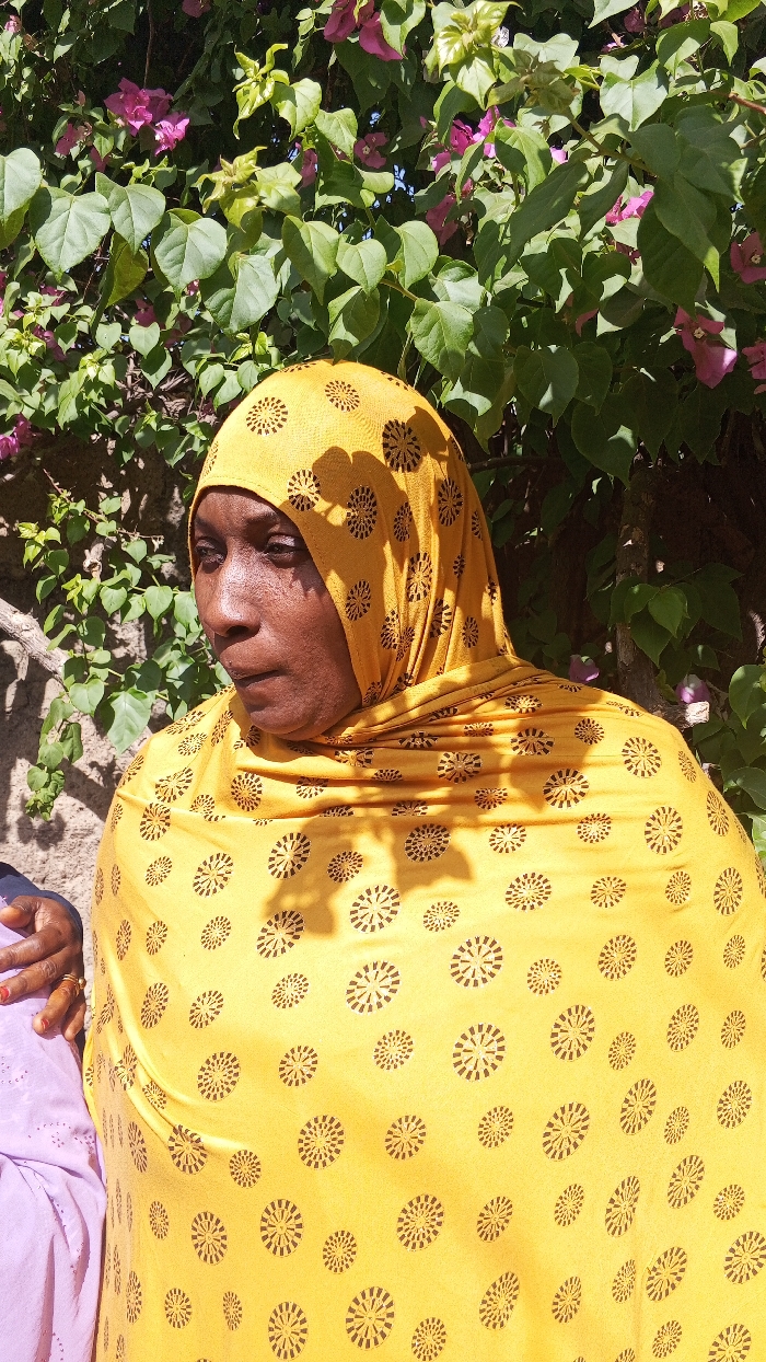 An outdoor daytime portrait captures an adult individual with dark skin, positioned centrally. They wear a yellow headscarf and matching body garment, both patterned with repeating dark brown radial designs. The individual's face is turned slightly to the left, with eyes gazing downwards and to the left, displaying a neutral expression. Strong sunlight casts distinct shadows across the yellow fabric. In the background, dense green foliage with pink bougainvillea flowers is visible against a partially obscured light-colored wall. A portion of a second individual's left hand, featuring red nail polish, is visible on the far left, resting on light purple fabric. The scene is located in the city of Unknown, Unknown.