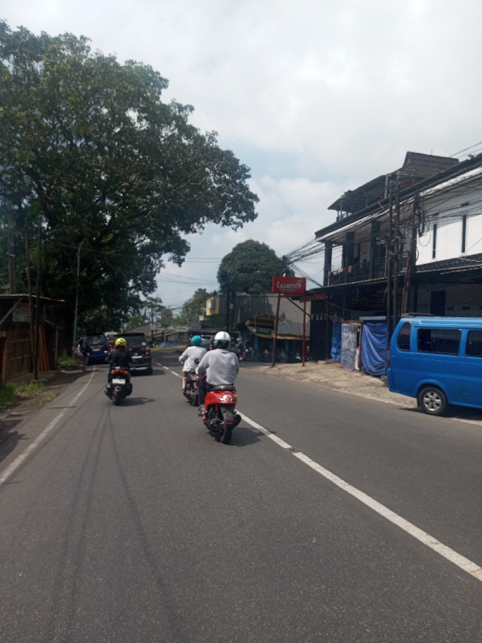 The image depicts a daytime street scene in the city of Niz Lakuk, India, with a clear sky partially obscured by clouds. The asphalt road occupies the foreground and midground, featuring a broken white lane marker on the right side and visible tire streaks on the left. Three individuals on motorcycles are moving away from the camera in the right lane. The closest rider wears a white helmet and light gray long-sleeved shirt, operating a red scooter. Behind them, another rider wears a light blue helmet and white shirt on a dark scooter. A third rider, further back, wears a yellow helmet and dark top on a black scooter. In the background, a black SUV and a blue car are also visible. On the right side of the road, a blue minivan is parked adjacent to a sidewalk area. This area transitions into a building facade partially covered by blue tarps, and further right, a multi-story building with exposed utility wires and poles. A red sign with "LAZATTOH" is mounted on a pole near the buildings. The left side of the road is bordered by dense green foliage from large trees, with some wooden fencing or structures visible beneath them.