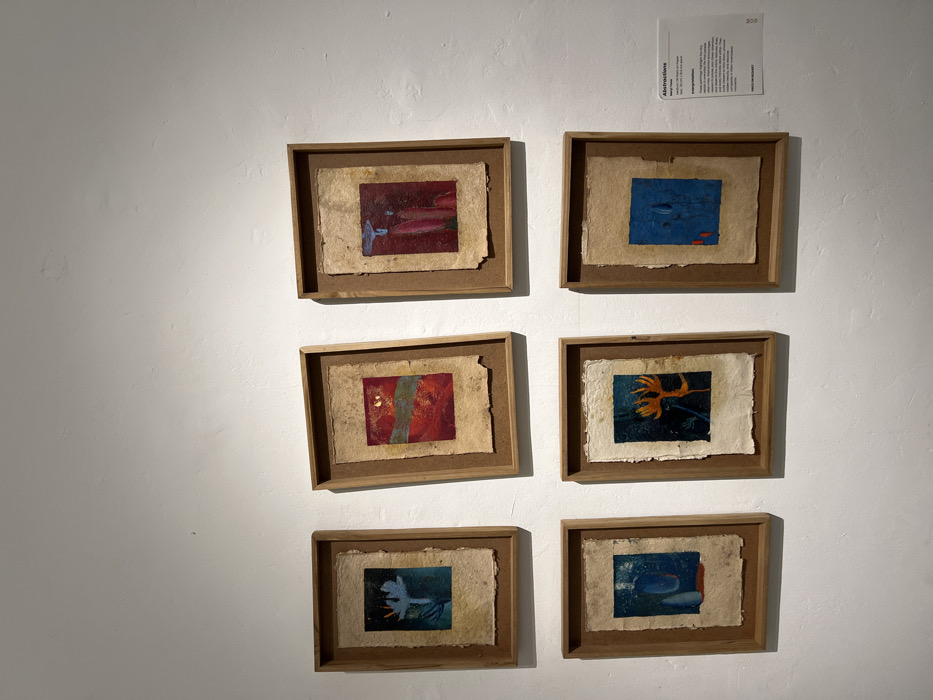 Six framed paintings hang on a white wall, each depicting an abstract floral design. The frames are made of wood with a light brown finish and all have a similar style with a thin, gold, embossed frame. The paintings are on textured paper and have a mottled, earthy look. The paintings are in a gallery or exhibit space. The location of the gallery, based on the given coordinates, is the City of Marra, India. A small white sign, on the right side of the image, is attached to the wall.