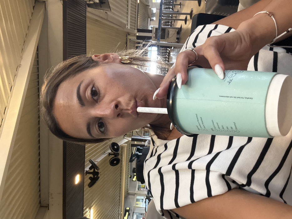 A woman with brown hair and gold hoop earrings is drinking from a light blue cup with a straw. She wears a black and white striped shirt. Her fingernails are long and white. A silver ring is on her finger, and a silver bracelet adorns her wrist. The background appears to be a gym with fitness equipment. The woman is facing the camera with a slight pout.