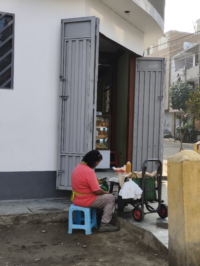 An outdoor scene in Ate, Peru, depicts a woman sitting on a light blue plastic stool outside a commercial building
