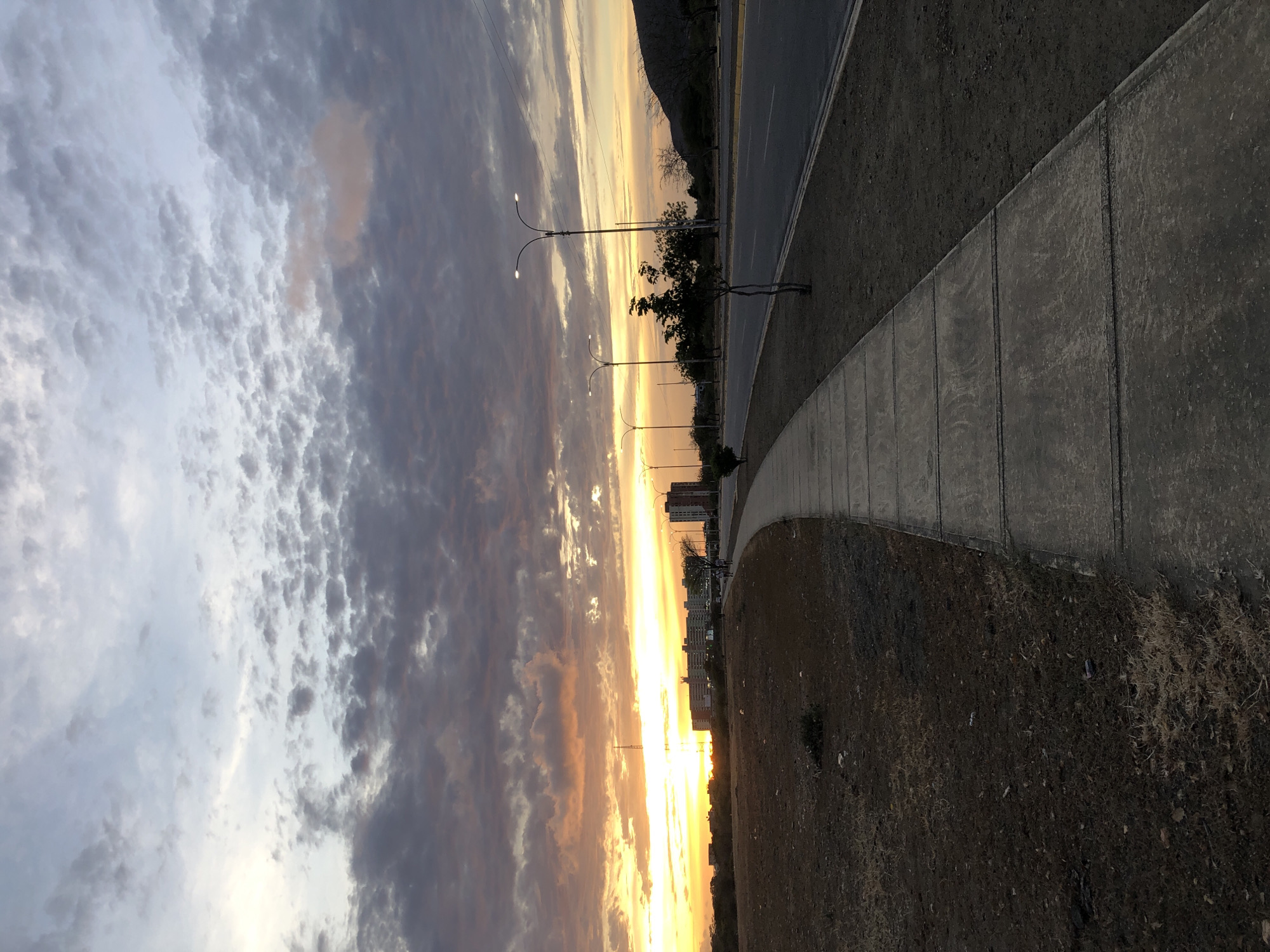 The image depicts a scene at sunset in Altagracia, Venezuela. A paved sidewalk runs along the right side of the frame, bordered by a grassy area. Adjacent to the sidewalk is a road. Streetlights line the road. In the background, buildings and a mountain can be seen. The sky is filled with clouds illuminated by the setting sun, creating a gradient of colors from orange and yellow to gray and blue.