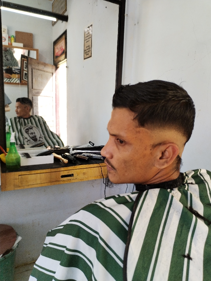 A male individual is seated in a barbershop in Mns Alue, Indonesia