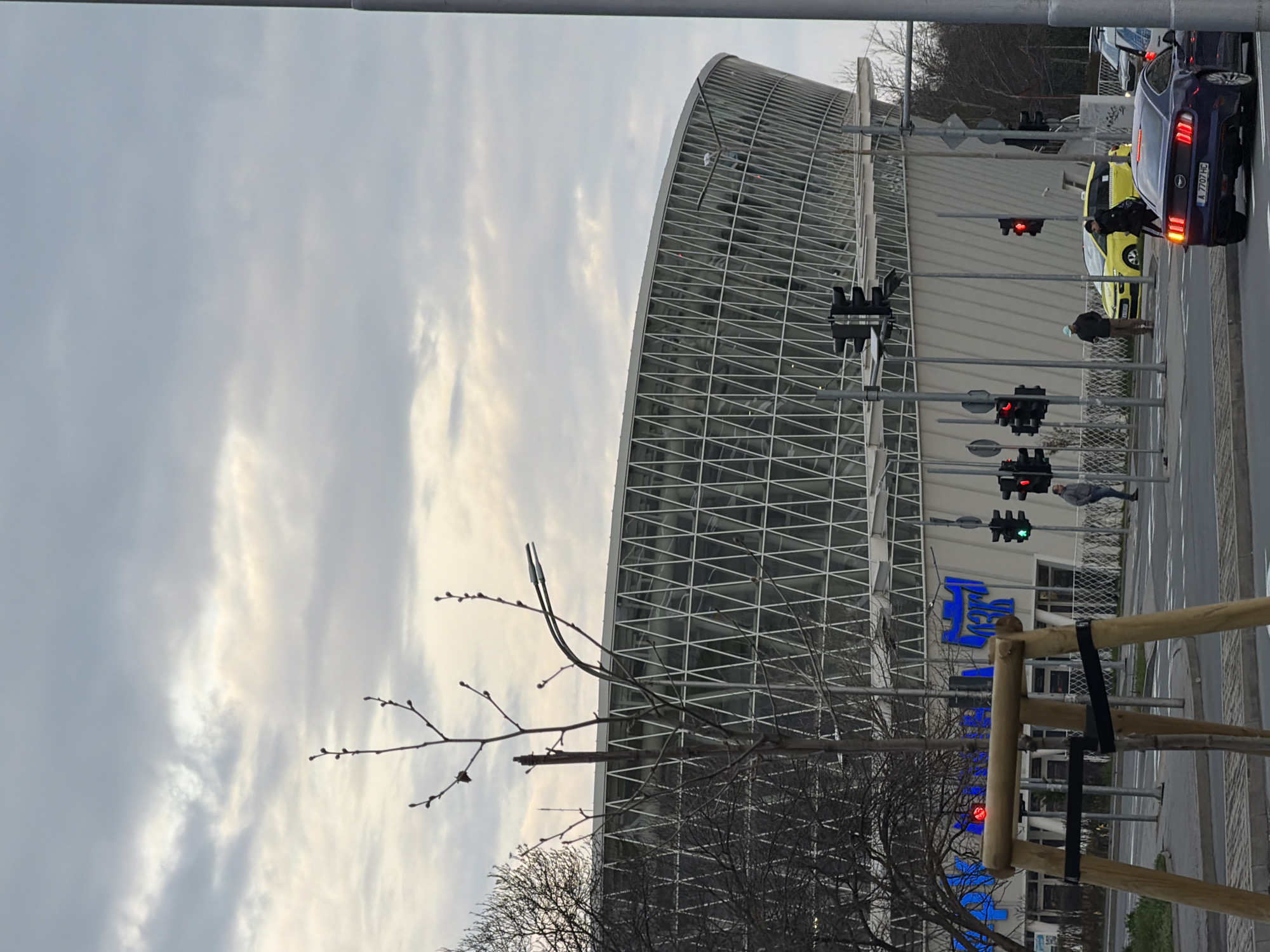The image depicts a street scene with a modern, curved building featuring a grid-like facade on the right side. In front of the building, there are traffic lights showing red and green signals. Cars are stopped at the intersection, including a dark blue car and a yellow taxi. Pedestrians are present, some appearing to be crossing the street. Bare tree branches are visible in the foreground, partially obscuring the building. The sky is overcast. The city is Unknown, Unknown.