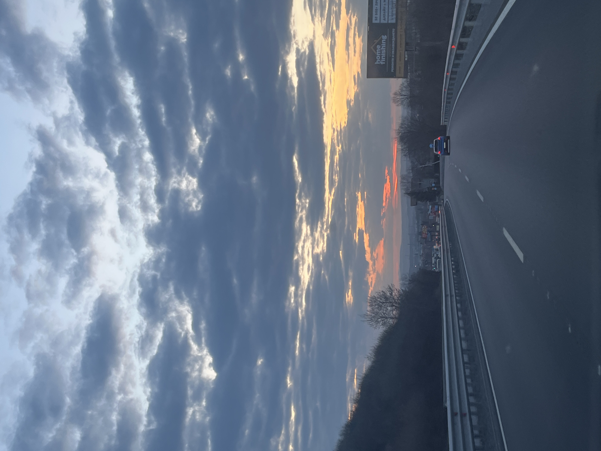 The image depicts a multi-lane asphalt road in Marchaevo, Bulgaria, at either sunrise or sunset. The perspective is from within a vehicle, looking forward. The sky is largely covered by dense, dark grey clouds, with visible breaks revealing patches of lighter blue sky and a prominent band of yellow-orange to reddish-orange light along the lower horizon on the right. To the left, a dark, tree-covered hill slopes upwards, while the right side of the road features a metal guardrail with red reflectors mounted along its top edge. Beyond the guardrail, several bare deciduous trees are visible, followed by a distant panorama of low-lying buildings and faint urban light sources. A large commercial billboard is positioned on the right side of the road, displaying the English text "home finishing" and Bulgarian text "РЕМОНТИ И ОБЗАВЕЖДАНЕТО." The road itself is dark asphalt, with a solid white line marking the right edge and dashed white lines separating the lanes. A single dark blue hatchback vehicle is observed traveling in the right lane, approximately 50 meters ahead of the camera's position. No human figures are visible.