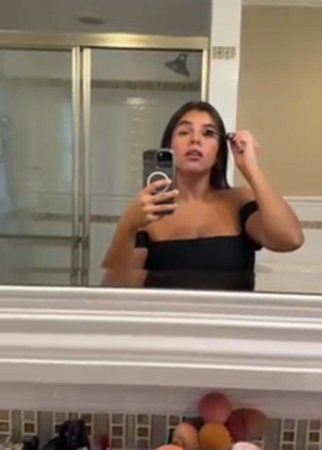 young woman standing in a bathroom, facing a mirror. She is holding a smartphone in one hand and using an eyeliner brush in the other to apply makeup to her upper eyelid. She is wearing a black, off-the-shoulder top. The bathroom features a tiled shower with a glass door, a white bathtub, and a variety of makeup brushes and cosmetics arranged on a shelf beneath the mirror. The lighting is bright, and the woman's reflection is clear in the mirror.