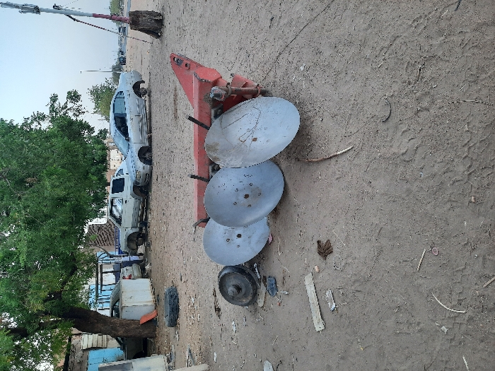 red farm implement with three large, round, metal discs lying on the ground, in the foreground