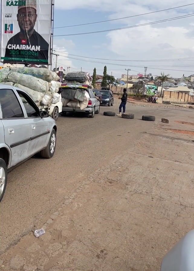 street scene in what appears to be an urban or suburban area, potentially in a developing country. The road is paved but in poor condition, with visible cracks and patches. In the foreground, there are several cars, some heavily laden with cargo on their roofs. A person wearing dark clothing and a face mask is seen in the middle of the road, using a long stick to move tires that are laid out as a road blockage or traffic control measure. In the background, there are buildings, power lines, and a billboard featuring a man's portrait and political messaging. The sky is partly cloudy. The overall atmosphere suggests a bustling but somewhat disorganized traffic situation.