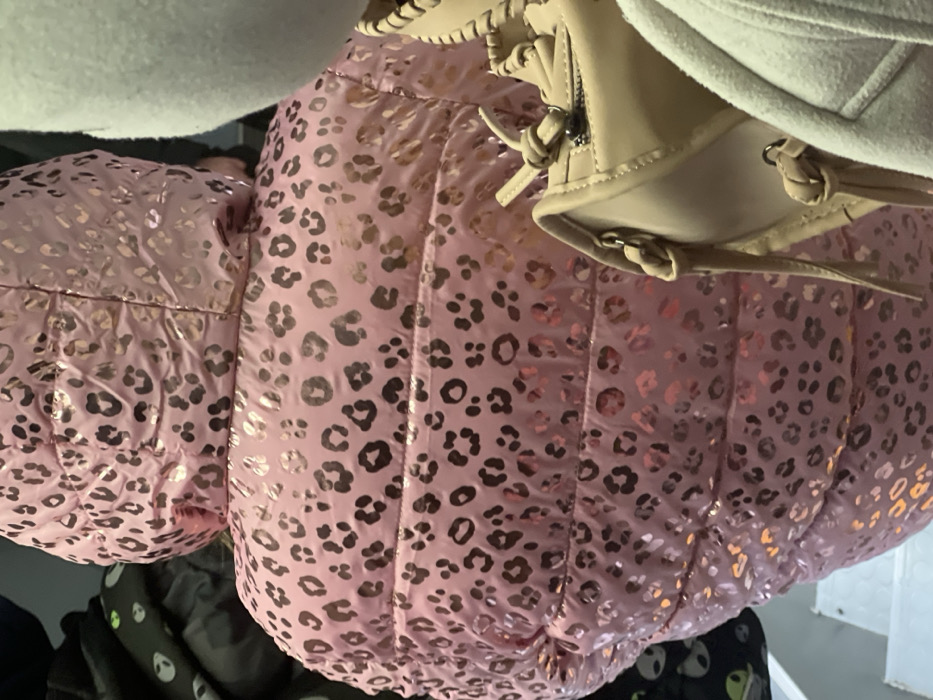 - "A pink puffer jacket with gold leopard print rests atop other garments" by FM-iR7bg1, licensed under CC BY 4.0