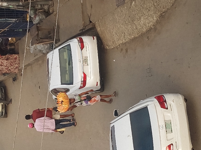 A street scene viewed from above includes three adults and two white cars. Two adults are walking together, while the other lies in the middle of the street wearing a decorative headdress. The cars are parked on either side of the street. Overhead cables are present, adding to the urban setting. Buildings and street details, such as pavement markings, are also visible.