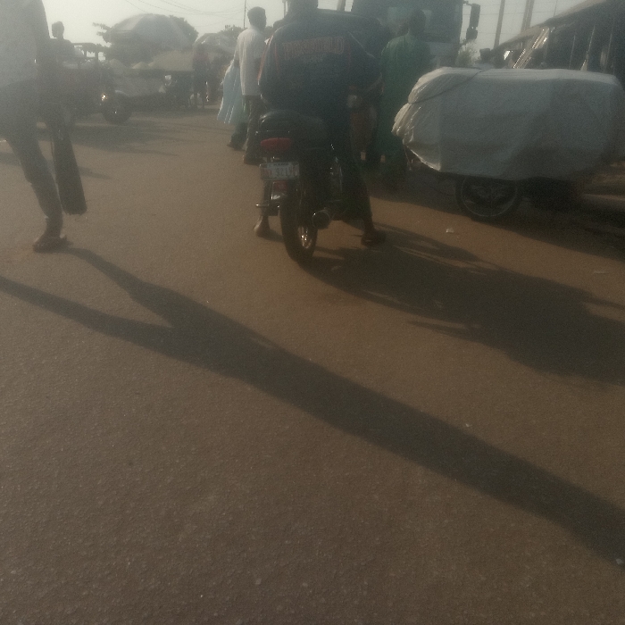 A sun-drenched street scene shows several figures walking and standing near vehicles. A motorcycle with a rider is central, positioned among pedestrians and a covered cart. A figure walks prominently in the foreground, casting a long shadow that dominates the lower portion of the frame. The background is slightly blurred, indicating a busy or congested area.