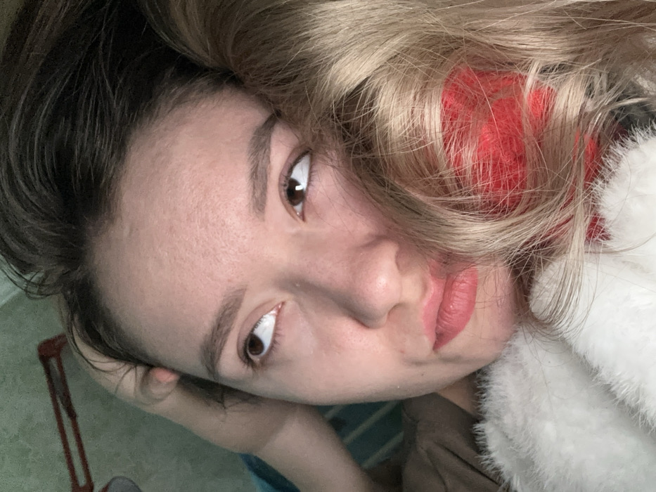 A woman with brown eyes and light skin gazes at the camera with a slight pout. Her hair is a mix of dark brown and blonde, some strands falling across her face. She wears light pink lipstick and has well-defined eyebrows. A fuzzy white garment is visible around her neck, and a flash of red material peeks through her hair. The background is blurry, revealing hints of green and blue.
