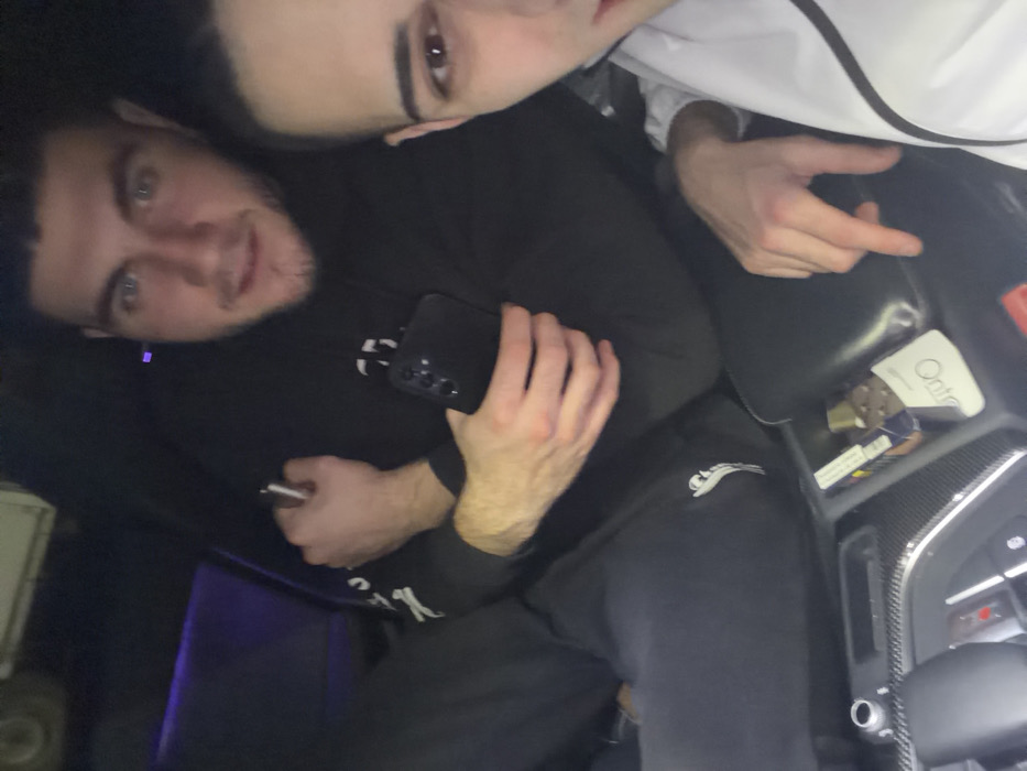 The image displays two male individuals inside a vehicle, illuminated by artificial light in a predominantly dark environment, suggesting nighttime or low-light conditions. **People:** 1. A male individual is positioned on the left side of the frame, facing the camera. He has dark hair, a light beard, and is wearing a black hooded sweatshirt with white markings on the sleeves, and black sweatpants with a white logo on the left thigh. His left hand holds a black smartphone. His right hand holds a metallic cylindrical object, consistent with a vape pen or a cigarette. 2. A second male individual is partially visible on the right, showing the right side of his face (eye, cheek) and his right arm. He wears a white garment, possibly a shirt or jacket. His right hand rests on the vehicle's center console armrest. This individual appears to be holding the camera. **Objects:** The vehicle's interior features a center console located between the two individuals. It includes an automatic gear shifter, textured carbon fiber-style trim, and an armrest. A storage compartment within the console contains a partial pack of "Opti" brand cigarettes, a metallic lighter, and a small, dark rectangular object. **Environment:** The background of the cabin is dark, with a subtle purple ambient light visible along the rear interior. The vehicle appears to be a modern passenger car. **Location:** No specific geographical features or identifying landmarks are present within the image to determine a precise location within the city of Kostinbrod, Bulgaria. The scene is confined to the interior of a vehicle.