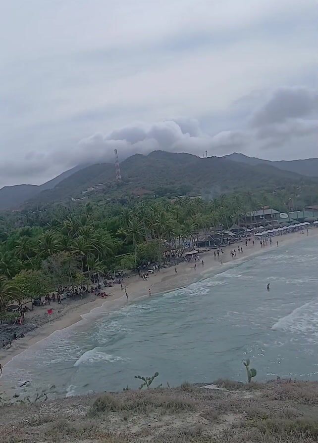 high-angle view of a crowded beach on a cloudy day. The beach is lined with palm trees and buildings, and people can be seen swimming, sunbathing, and walking along the shore. The waves are small and the water is a greenish-blue color. In the background are mountains covered in green vegetation. The overall scene appears to be a popular tourist destination.