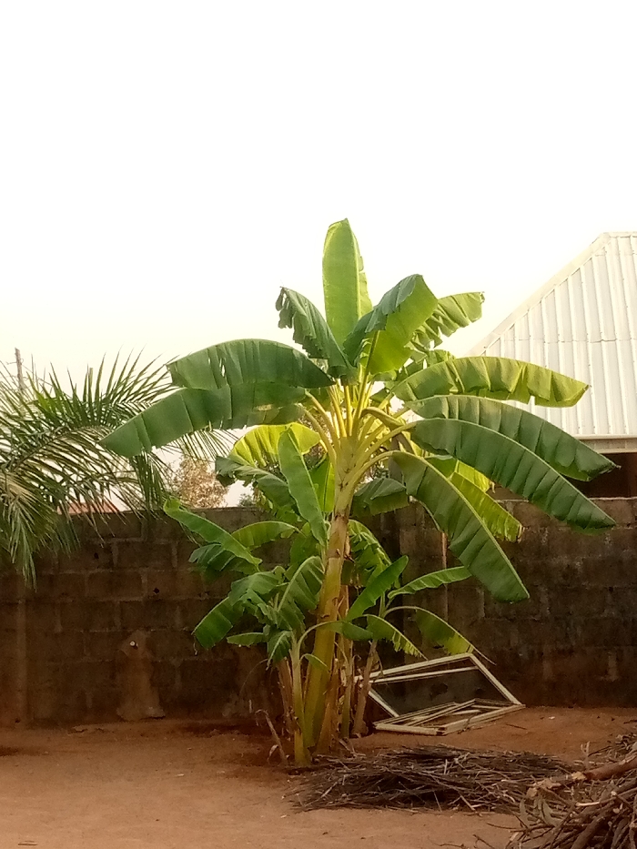 The scene depicts an outdoor area in Gaklang, Nigeria. A prominent banana plant, approximately 3-4 meters tall, with multiple green leaves and suckers at its base, occupies the central foreground. To the left, partial fronds of another tropical plant, possibly a palm, are visible. The midground features a dark grey concrete block wall, approximately 1.5 meters high. Above and to the right of the wall, a portion of a light-colored, corrugated metal roof of a building is visible. The ground is reddish-brown dirt. To the right of the banana plant's base, a stack of several light-colored, discarded window frames is present, alongside a small pile of dried woody debris. The sky is uniformly bright and off-white, suggesting overcast conditions or diffused sunlight. No individuals or animals are present.