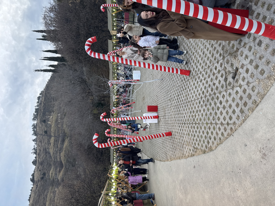 An outdoor festive market scene unfolds in a park area at the base of a large, tree-covered hill, likely Mtatsminda Hill, in Tbilisi, Georgia, under an overcast sky. The foreground comprises a curved concrete pathway on the left and a checkered pattern of hollow concrete pavers on the right. Numerous oversized red and white striped candy cane decorations are vertically arranged across the paved area, interspersed with white, bare artificial tree structures and two red cuboid objects. Approximately 20-30 individuals, including adults and children, populate the scene, dressed in winter attire. They are observed walking, standing, and browsing. Market stalls with green or brown tarpaulin roofs, illuminated by strings of warm white lights, line the left and right midground, suggesting a late afternoon or early evening event. A young boy in a green puffer jacket and blue jeans stands centrally, facing left, holding an object to his mouth. A woman with dark hair, wearing a brown coat and red garment, is partially visible on the far right, adjacent to a candy cane. Behind the boy, a woman in a beige coat stands, while another woman behind her holds a smartphone, apparently recording or photographing the scene. The background features a large, steep hill covered sparsely with bare deciduous trees and dense clusters of tall, slender evergreen trees, displaying visible terracing on its slopes.