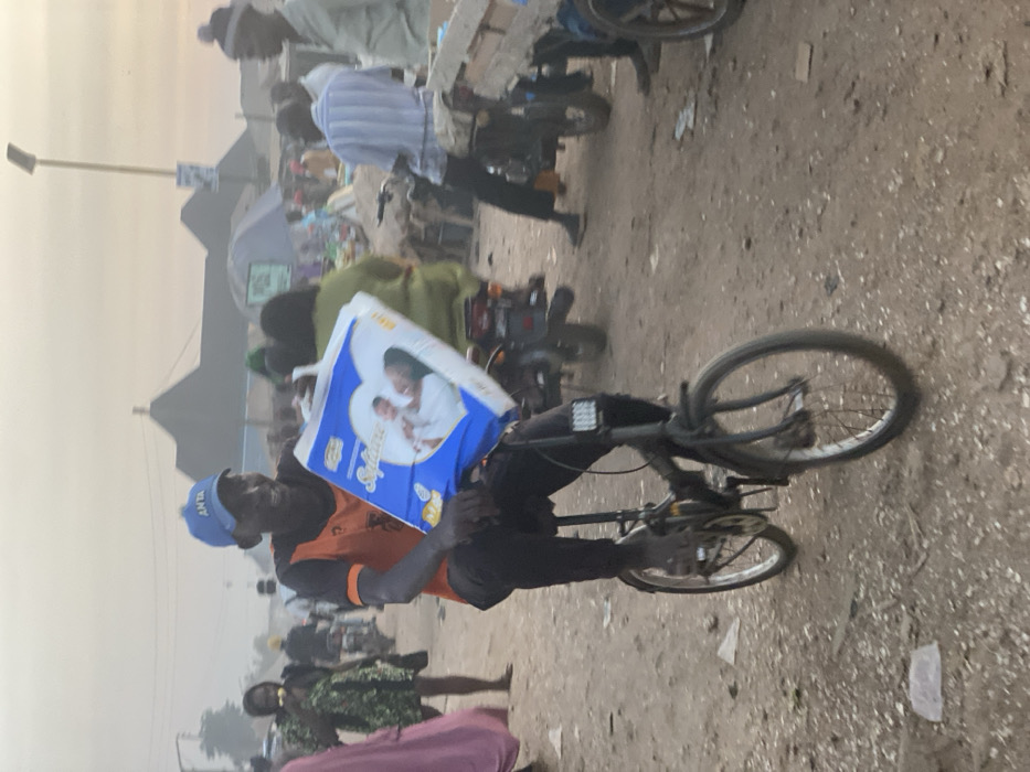 A man rides a bicycle, holding a blue package of diapers in front of him. He wears an orange shirt, black pants, and a blue baseball cap. Several people, some on motorcycles, move around him. The scene appears to be a busy street or market area with a dusty ground and hazy sky. Buildings and a light pole are visible in the background.