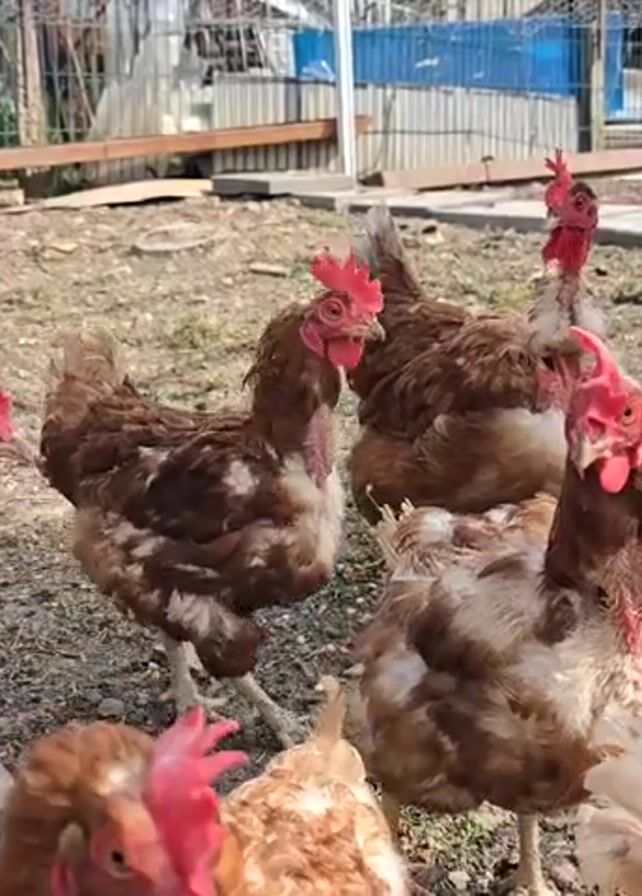 In an outdoor setting, a group of chickens huddle together on the ground, pecking at the dirt and debris. Most are reddish-brown in color, with one having a noticeably bare neck. A few of the chickens are facing forward, engaging the viewer, while others are looking down, presumably searching for food. In the background, more chickens roam freely, one standing atop a gray object. The area surrounding the chickens is covered in dirt, small stones, and the occasional piece of wood. A fence borders the scene, with greenery and yellow flowers visible behind it. The day appears bright and sunny, casting shadows across the ground.