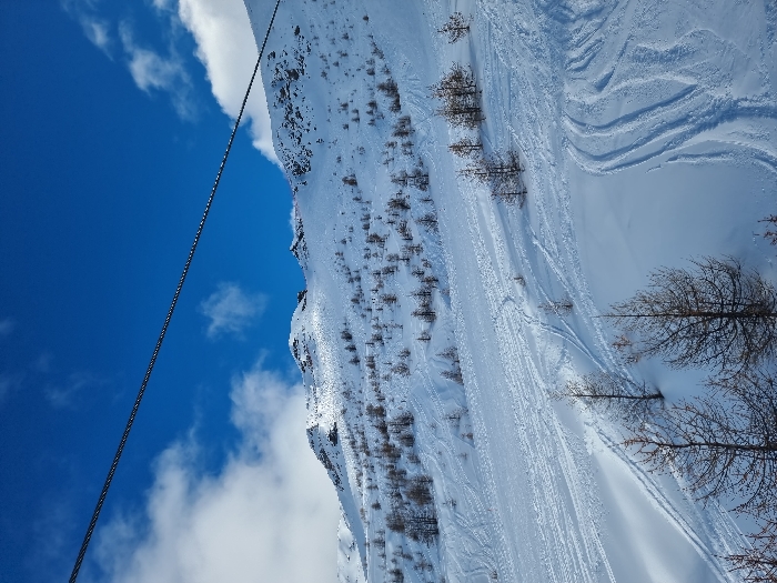 The image displays a snow-covered mountainous landscape in Sestriere, Italy, under a bright blue sky with sparse white cumulus clouds. A thick, dark cable, indicative of a ski lift system, stretches diagonally across the upper portion of the frame from the upper left to the upper right. The terrain below is a vast expanse of white snow, showing numerous ski tracks and trails winding across the slopes, particularly prominent in the midground and foreground. Scattered throughout the snowy landscape are numerous leafless deciduous trees, appearing as dark, bare silhouettes against the white snow. The background features a higher snow-capped mountain ridge with visible rocky outcrops. No individuals or man-made structures other than the cable are present in the scene. The snow exhibits varying textures, from smooth drifts to areas disturbed by ski activity.