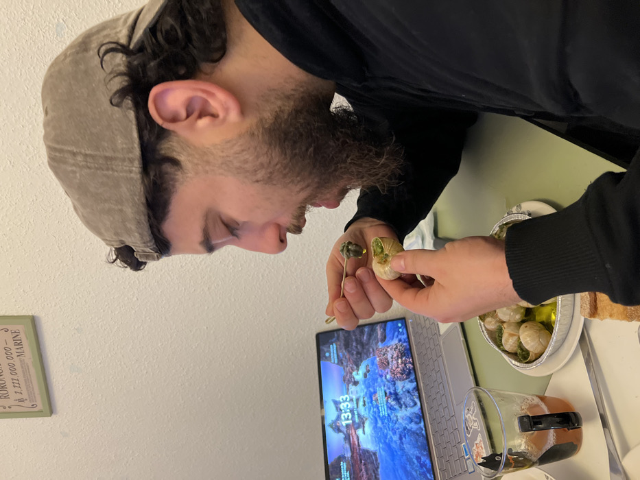 An indoor scene shows a male individual, with dark curly hair, a beard, and a gray baseball cap worn backward, engaged in eating escargots
