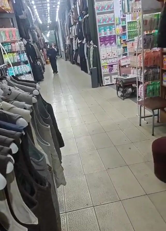 narrow aisle in what appears to be a market or shopping center. The aisle is brightly lit with overhead fluorescent lights and has a tiled floor. Clothing racks line both sides of the aisle, displaying various garments including jackets, shirts, and vests. On one side, shelves stocked with items like baby products and household goods are visible. In the background, a person is walking down the aisle. As the camera pans, more clothing items come into view, neatly arranged on shelves or hung on display. A small maroon ottoman sits near a clothing display. Someone, apparently the person recording the video, walks past the camera, briefly obscuring the view.