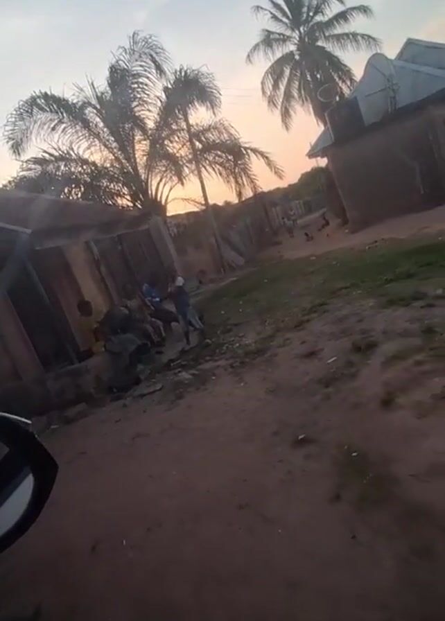 dirt road in a rural area with a few small buildings and palm trees. Several people are gathered near one of the buildings, and there is a car parked nearby. The sun is setting, casting a warm glow over the scene. The video appears to be taken from inside a moving vehicle, as the camera angle shifts slightly. The overall impression is of a quiet, everyday scene in a village or small town.