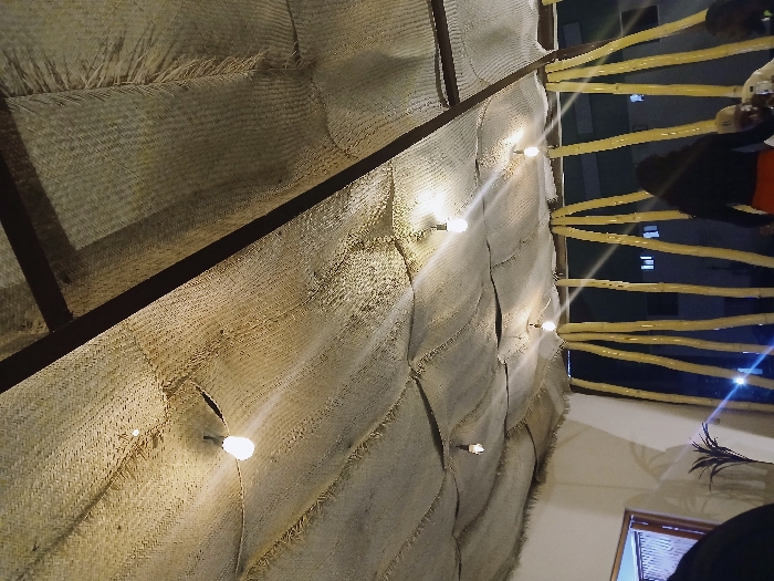 An angled view reveals a thatched roof adorned with light bulbs. Below, bamboo poles line the exterior, backed by a dark, indeterminate view, perhaps through a window. A partial view of a room and a window with blinds are visible in the lower-right, providing context to the scene.