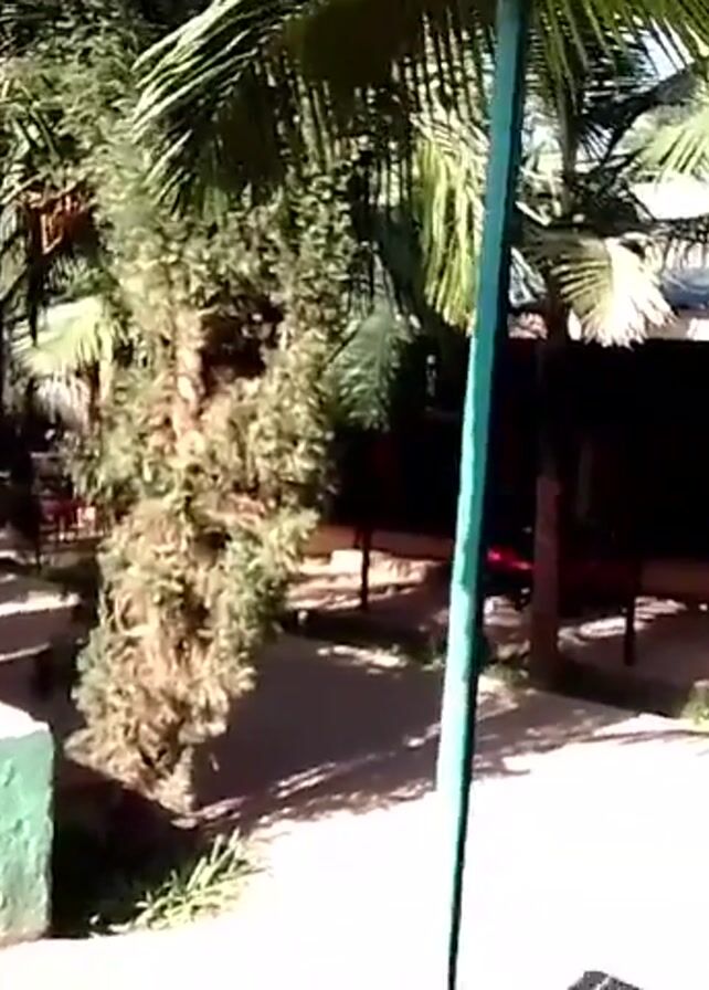The camera is inside a vehicle, possibly a golf cart, moving through a park-like area. The area is decorated with palm trees and various smaller bushes. There are covered seating areas with green concrete bases scattered throughout. Sunlight streams through the foliage, creating bright and shady spots. In the distance, a small building with an open storage area is visible. The camera's perspective is from the driver's seat, showing the view through the front windshield. The overall impression is a relaxed, outdoor setting.