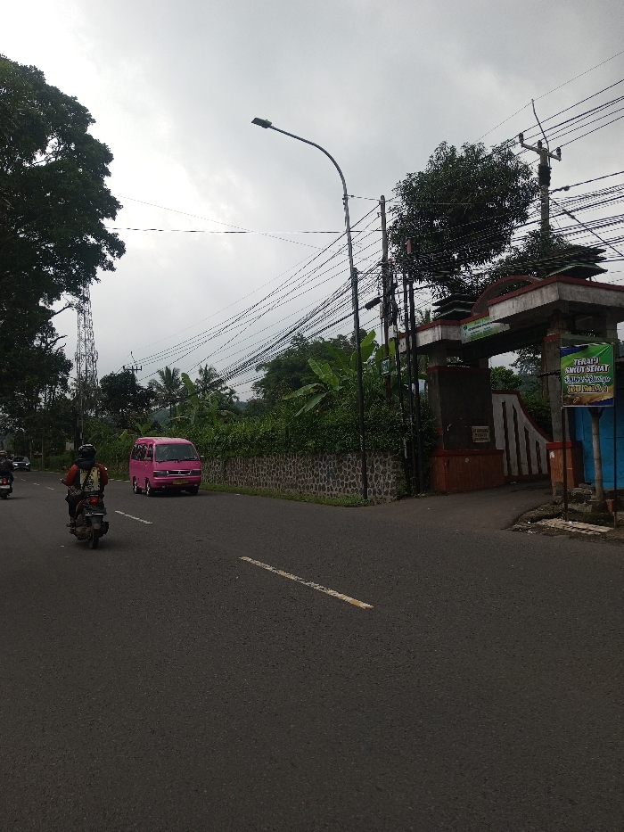 The image displays a street scene in the city of Sandamal Eliya, Sri Lanka, under a uniformly overcast, grey sky. The asphalt road, dark grey in color, occupies the foreground and midground, marked by a broken white center line and a shorter broken yellow line to its right. On the left side of the road, a person wearing a red-orange jacket, a yellow reflective vest, and a black helmet is riding a dark-colored motorcycle, moving away from the viewer. Another motorcycle and rider are faintly visible further down the road in the distance. A large, dark green tree with dense foliage occupies the upper left, partially obscuring a tall, metallic lattice communication tower behind it. In the midground, a pink passenger van with a white roof is stationary or parked on the right side of the road, oriented slightly towards the left. It features silver-colored wheels. The right side of the scene is bordered by a low stone wall constructed from dark grey stones with light mortar, topped with green foliage. Beyond this wall, an ornate concrete entrance structure is visible, featuring a brown base, white decorative balustrades, and a multi-tiered roof design. A green sign with white text is affixed to this entrance, and a blue sign with white and yellow text is positioned immediately to its right. A cluster of utility poles supporting a dense network of overhead electrical and communication wires is prominent on the right, extending across the upper portion of the frame. A modern black streetlight on a curved pole is located above the road to the right of center. Behind the wall and entrance, abundant tropical vegetation, including banana plants and palm trees, is discernible.