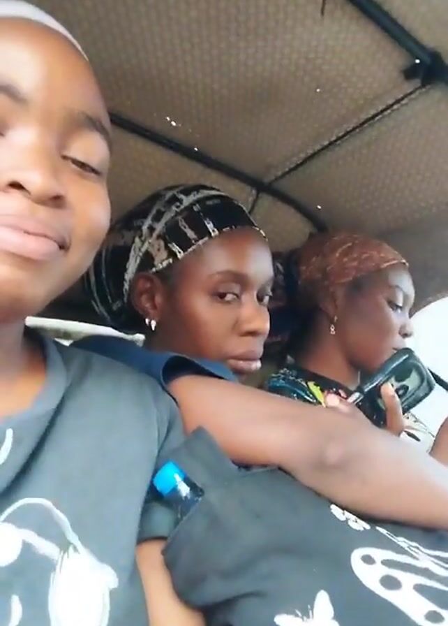 Three young women are riding in what appears to be a motorized rickshaw or auto-rickshaw. The woman in the foreground is smiling and looking directly at the camera. The woman in the middle looks more serious or contemplative. The woman in the back is looking at her phone. The interior of the vehicle is visible, including the ceiling with a patterned lining and metal bars. The women are wearing casual clothing. The foreground shows part of a black tote bag with a white butterfly design on it, along with a blue water bottle. The background shows glimpses of what looks like an urban environment through the rickshaw's window.