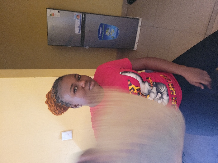 An indoor scene in Suleja, Nigeria, depicts a female subject, appearing to be a young adult with dark skin and orange braided hair styled in an bun-like updo