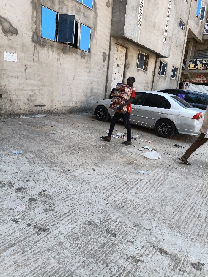The scene, set in Fagge C, Nigeria, depicts an outdoor urban area characterized by concrete structures. A young male, wearing a red short-sleeved shirt, dark trousers, and dark sandals, walks right, carrying a stack of six rectangular boxes with a red, white, and blue pattern against his chest. Partially visible to the far right are the lower legs and feet of a second individual, wearing brown trousers and light-colored sandals. Behind the primary subject, a silver Honda Civic sedan with dark multi-spoke wheels is parked, facing left, with a dark vehicle partially visible behind it. The ground is textured concrete, scattered with miscellaneous litter, including plastic and paper debris. The background consists of two multi-story concrete buildings. The structure on the left features an unpainted concrete facade with several blue-tinted windows, some partially open. The adjacent building exhibits white-framed windows and a pair of white, paneled double doors. The area is under natural daylight.