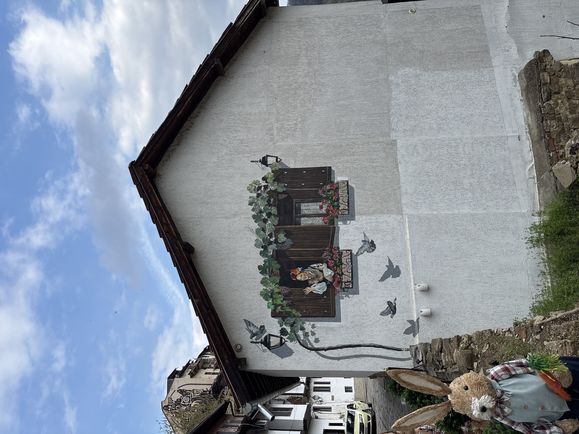 An eye-level medium shot of a wall, featuring a trompe l'oeil mural painting, possibly located in Veliko Tarnovo, Bulgaria