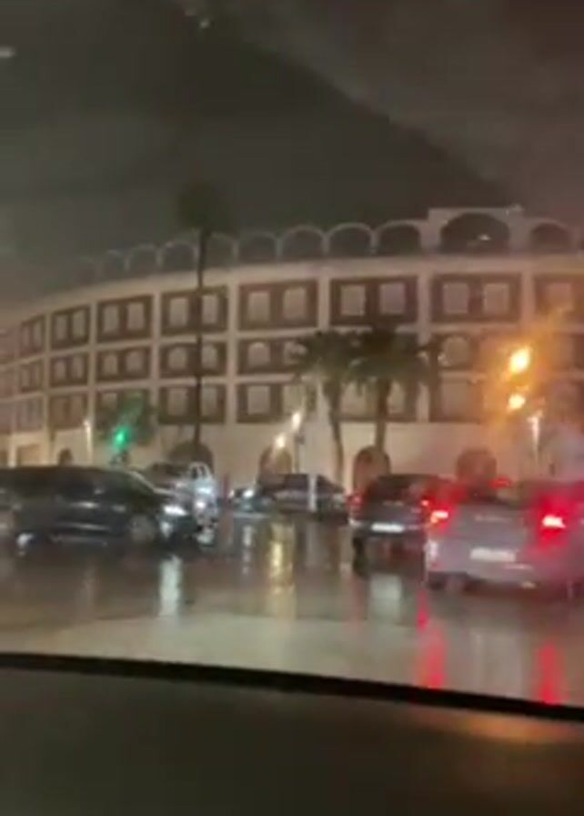 The video is taken from the inside of a car driving on a rainy night. The camera is looking out of the windshield as several cars are stopped at a traffic light. Across the street is a large, multi-story building with white arches and square brown windows. Palm trees line the street in front of the building. The street is wet from the rain and the headlights and taillights of the cars reflect on the pavement. A person on a motorcycle can be seen driving.