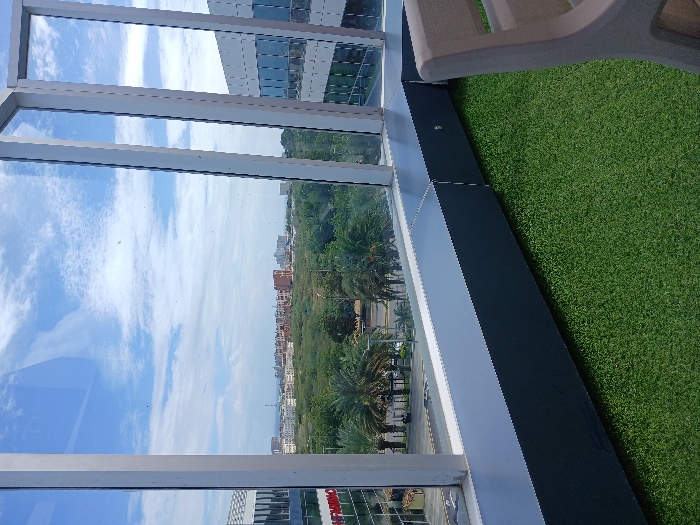 A high-angle perspective shows a cityscape viewed through a modern window frame. Buildings of varying heights are visible, with dense green vegetation covering a significant portion of the scene. A blue sky with white clouds dominates the upper part of the image. Artificial green turf borders the window, with part of a beige chair visible in the corner. The overall impression suggests a view from an elevated balcony or rooftop.