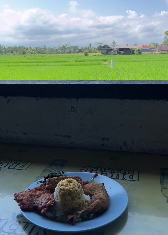 A plate of food rests on a table overlooking a verdant rice paddy