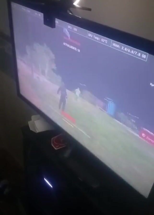 person playing a video game on a large TV. The game appears to be a first-person shooter, with a character walking down a road. The game's stats are displayed on the top right of the screen, including GPU usage and temperature, and VRAM usage. The TV is sitting on a black TV stand. There's also a webcam mounted atop the television. The environment is dimly lit.