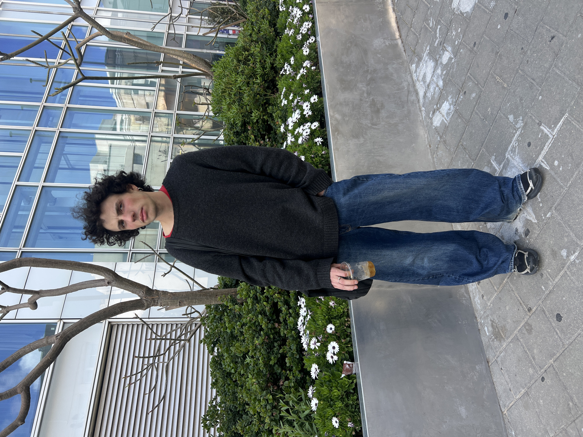 A person is standing outdoors, holding a beverage in a clear plastic cup. The person has dark curly hair, wears a dark grey sweater with a red shirt visible at the neck, and blue jeans. They are standing on a grey paved area with concrete blocks. Behind them is a planter box filled with green bushes and white daisies. A modern building with a glass facade is visible in the background, partially obscured by a bare tree. Based on these elements, the location may be in the city of Tel Aviv, Israel, as modern architecture and unique vegetation are typical of the area.