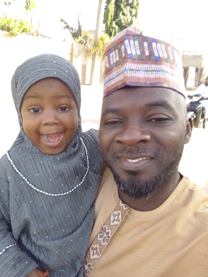 A close-up portrait, likely a selfie, depicts an adult male and a young child outdoors in Babban Giji, Nigeria