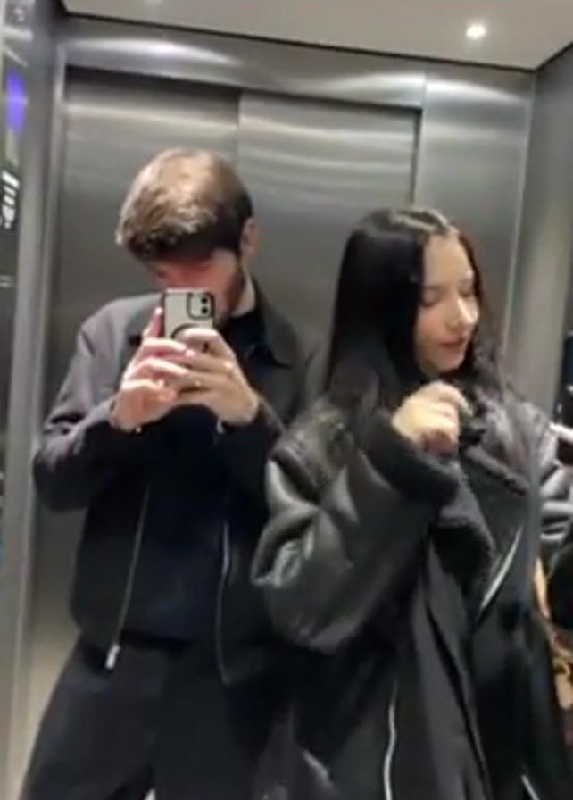Two people stand in an elevator. The elevator has brushed steel doors and a mirrored wall to the left. The male is in the left of the frame and wears a black shirt, black trousers and a black jacket. He holds a phone in front of him and is taking a photo. The female is to the right, wearing a black jacket with black fur lining, black trousers and a white top. She holds a phone in front of her and makes a small wave, before adjusting her hair and posing for a photo. She wears a brown bag on her shoulder. The elevator doors remain closed.