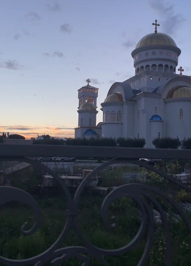white Orthodox church with golden domes at dusk. The sky is a mix of blues, oranges, and grays. The church has multiple towers, each topped with a cross. There's an ornate metal fence in the foreground, and some greenery and construction materials visible behind it. A few cars are parked in the background. The camera angle provides a low-level view of the church, slightly obscured by the fence.