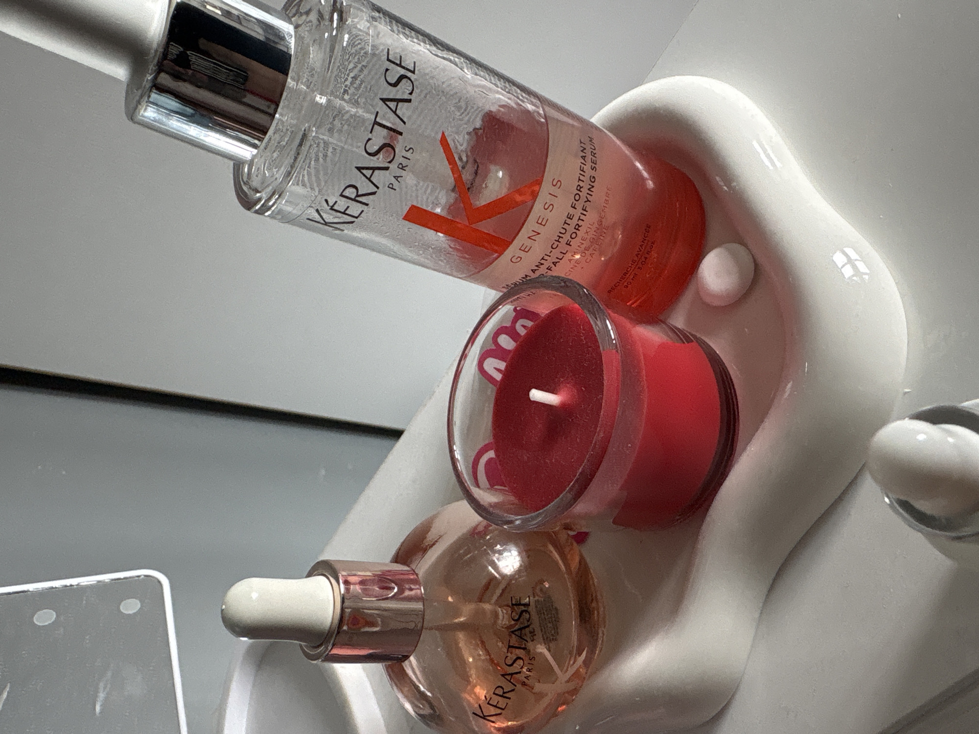 close-up view of various items arranged in what appears to be a white, kidney-shaped sink. The objects include a bottle of Kérastase Genesis serum, a small red candle in a glass holder, another bottle of Kérastase product, and a small white pill. The Kérastase Genesis serum is tilted at an angle, with its label visible. The lighting is somewhat subdued, casting shadows across the scene. The overall composition suggests a collection of beauty or personal care items. There is no information available to indicate the location or the presence of people in Cheshnegirovo, Bulgaria.