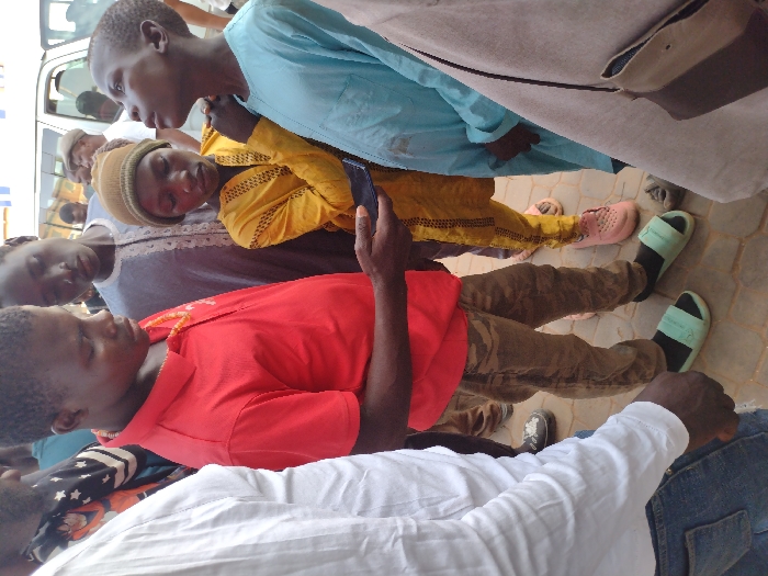 Several individuals gather in an outdoor setting. One person in a red shirt holds a dark-colored phone. Another wears a yellow garment and a knit cap. A taller individual is clad in a light blue top. Footwear includes slides in pink and green. The ground appears to be paved with brick or stone tiles. Partial views of other people in white shirts and patterned fabrics are visible, contributing to the group atmosphere.