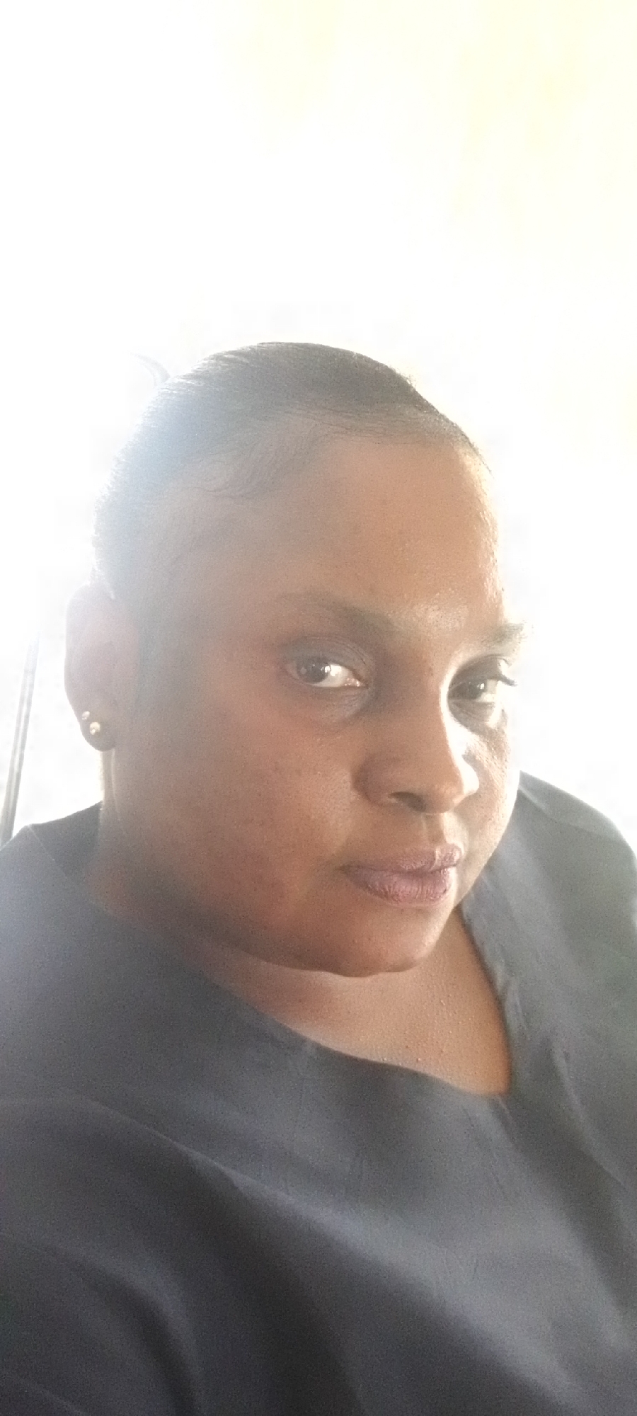 The image depicts an adult female subject, presumably in the city of Narayi, Nigeria. The subject, who has dark brown skin and dark hair pulled back, is positioned for a headshot that includes her upper torso. She wears a small, spherical, gold-colored stud earring in her visible left earlobe. Her lips are closed, with a brownish-mauve pigment. Her dark eyes are directed slightly right of the camera's axis. She is dressed in a dark-colored top, appearing either dark blue or grey. The background is uniformly overexposed white, indicating a strong light source behind the subject and providing no discernible environmental details except for a faint vertical dark line at the extreme left edge of the frame.